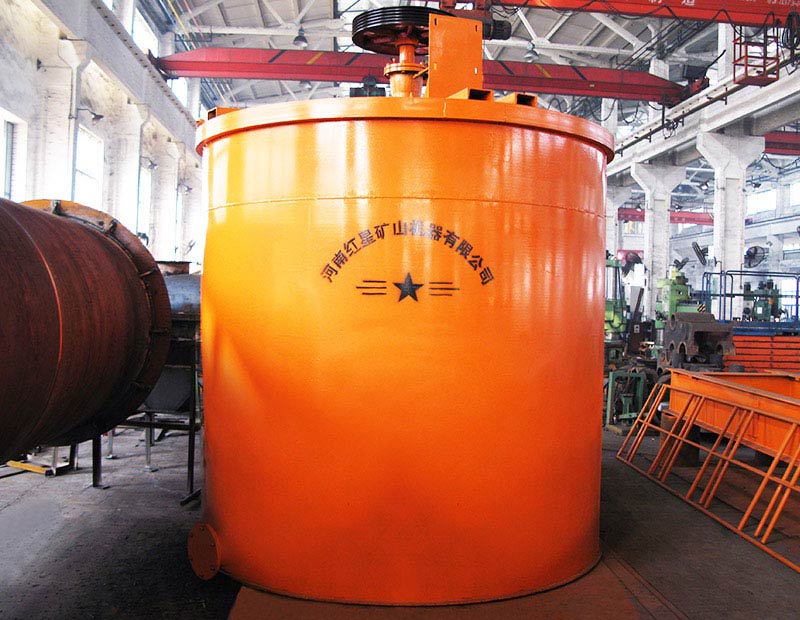 攪拌桶由電動機、葉輪、定子、軸承等部件組成,采用平底桶形輻射循環(huán)螺旋葉輪機械攪拌式方法進行攪拌作業(yè)。攪拌槽工作時電動機牽引三角帶傳動裝置帶動葉輪旋轉(zhuǎn),礦漿和藥劑在葉輪的勻速攪拌作用下實現(xiàn)充分的相互混合,增加藥劑對礦漿的反應(yīng)時間,對藥物的反應(yīng)質(zhì)量進行強化,從而使物料得到充分的攪拌和混合,為下一階段的浮選機生產(chǎn)做好必要的準備條件。