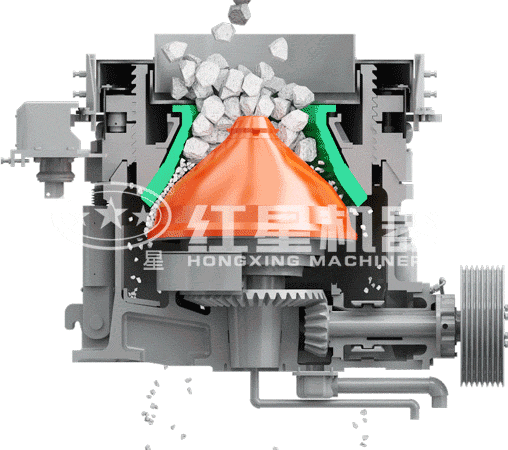 液壓圓錐破碎機工作時,偏心軸上的動錐在電動機的帶動下不停地周期性的擺動,使得動錐和靜態(tài)錐之間的距離不斷的發(fā)生變化,物料從進(jìn)料口進(jìn)入破碎腔后受到動錐和靜錐的擠壓后破碎,經(jīng)過多次的擠壓破碎達(dá)到要求粒度后從出料口排出。